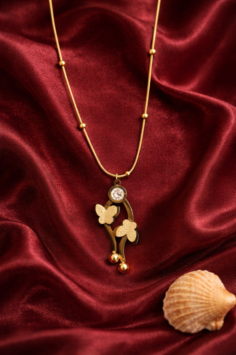 Inspired by blooming nature and delicate butterflies, this elegant necklace features a graceful pendant with butterfly motifs flowing along a curved design, highlighted with a subtle sparkling stone at the top. The artistic structure creates a unique minimal necklace that blends softness with modern elegance.