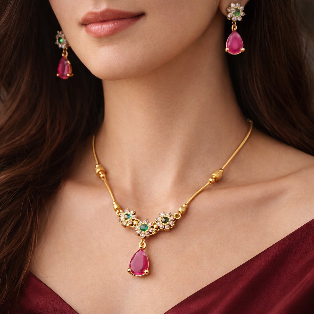 Inspired by royal Indian craftsmanship, this elegant floral necklace blends traditional charm with modern sophistication. Adorned with delicate floral motifs, sparkling American diamonds, and a striking emerald centerpiece, the design is beautifully finished with a rich ruby drop that adds a luxurious touch to your look.