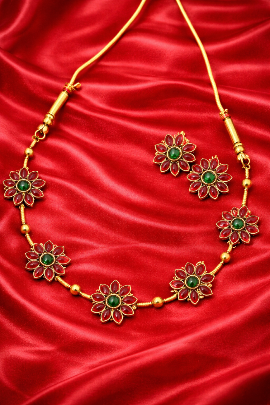Inspired by traditional Indian floral artistry, this royal necklace set showcases beautifully crafted flower motifs adorned with vibrant ruby stones and rich emerald centers. The symmetrical floral design reflects timeless heritage while adding a bold yet elegant statement to your jewellery collection.