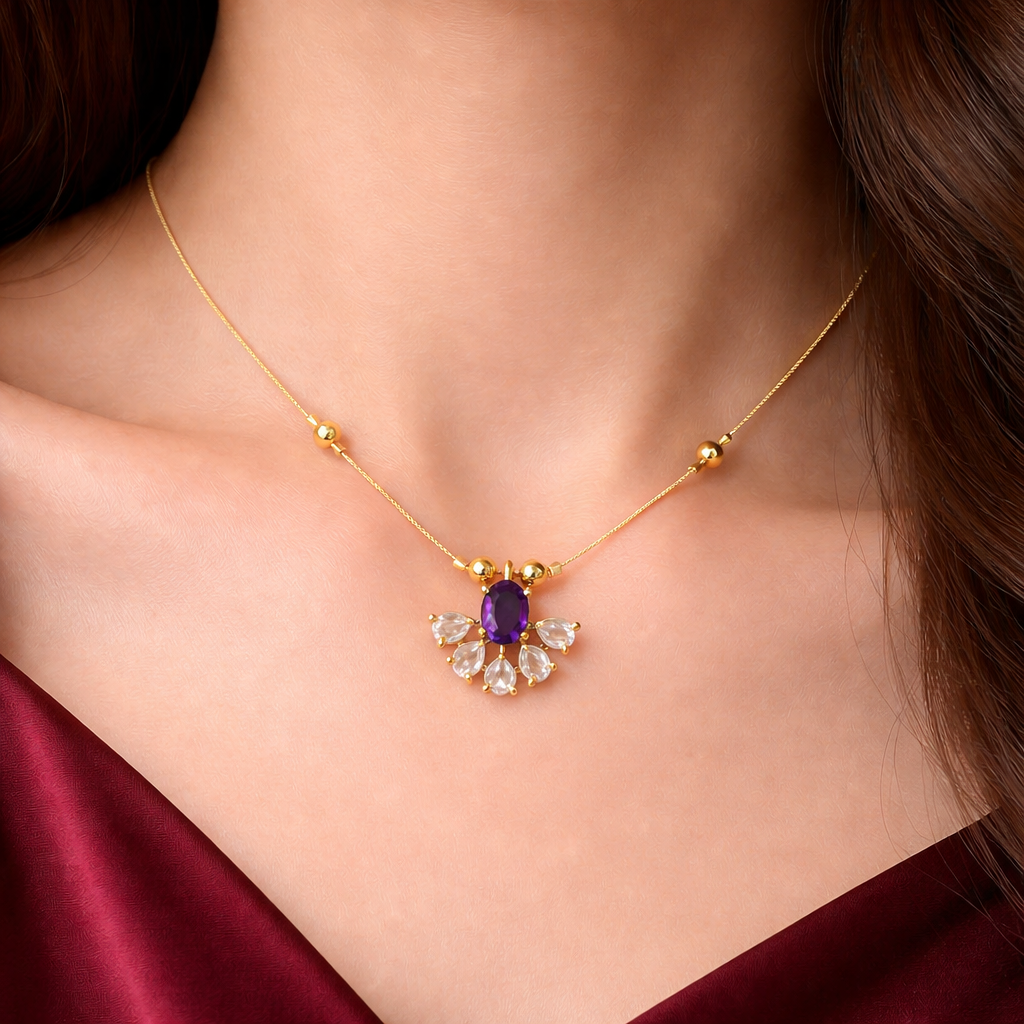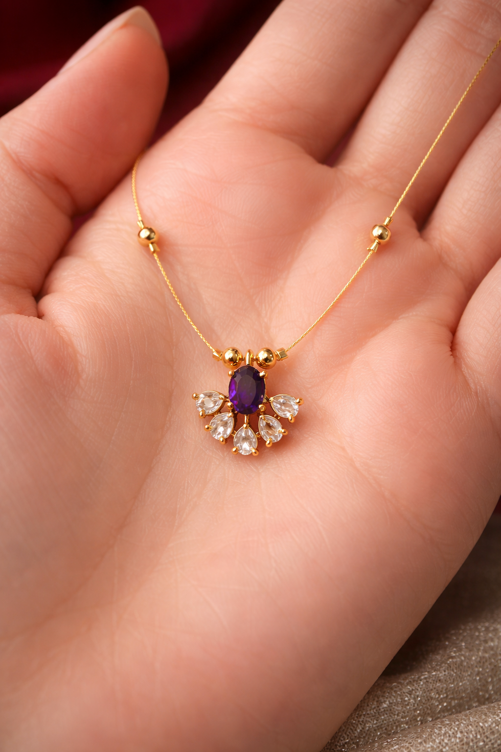 Inspired by delicate floral elegance, this minimal necklace features a deep sapphire centerpiece surrounded by shimmering American diamonds arranged in a graceful petal design. The refined craftsmanship brings together modern simplicity and timeless charm, making it a standout yet subtle piece.