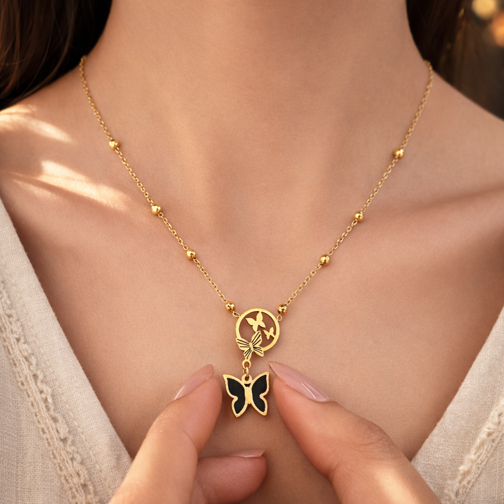 Inspired by the beauty of butterflies in motion, this minimal necklace features delicate butterfly charms with a sleek black enamel finish, suspended gracefully from a fine gold chain. The layered design adds a modern and stylish touch while maintaining a soft, feminine appeal.