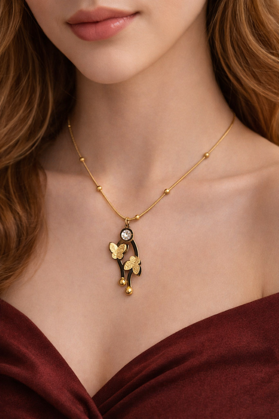 Inspired by blooming nature and delicate butterflies, this elegant necklace features a graceful pendant with butterfly motifs flowing along a curved design, highlighted with a subtle sparkling stone at the top. The artistic structure creates a unique minimal necklace that blends softness with modern elegance.