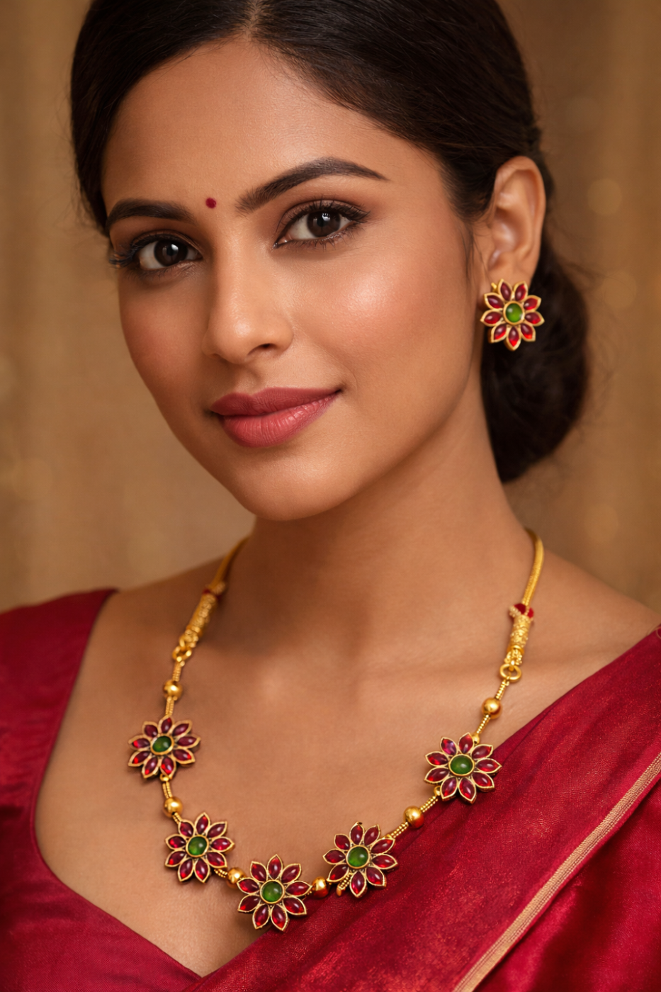 Inspired by traditional Indian floral artistry, this royal necklace set showcases beautifully crafted flower motifs adorned with vibrant ruby stones and rich emerald centers. The symmetrical floral design reflects timeless heritage while adding a bold yet elegant statement to your jewellery collection.